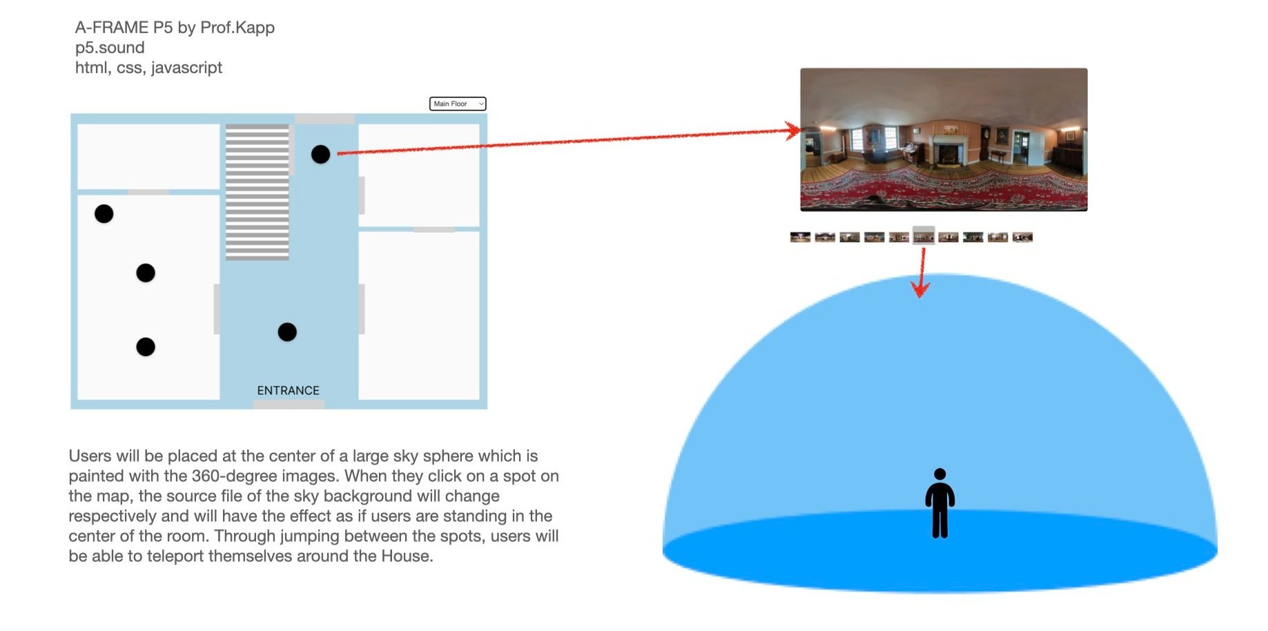 A-frames objects are added to the scene where the current spot is close to the staircase. Clicking on the elevator arrows will teleport the user to the respective floor.